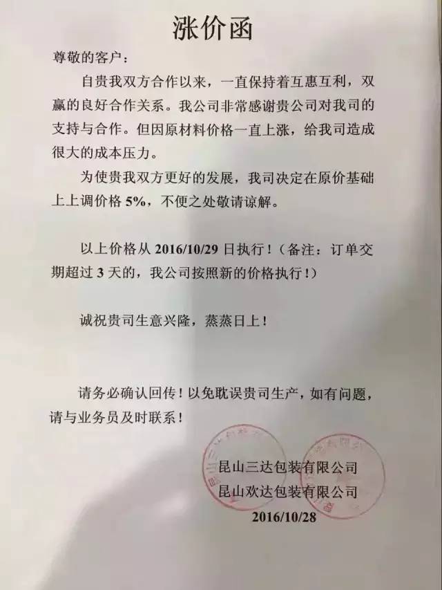 恭喜之前已发货的客户,您的货现在已经升值了!看这个趋势,原料还会继续上涨,涨价潮真的开始了:亲爱的客户,别说你不知道 !