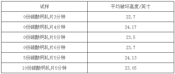 2.轧片的时间决定塑化度的高低,从上述试验得出,5分钟以后塑化度基本不变,所以制品的落锤冲击性能基本不变,轧片4分钟制品的落锤冲击性能最好,添加碳酸钙5份的效果跟不添加碳酸钙塑化4分钟的效果相当,10分碳酸钙的效果跟0份碳酸钙塑化5分钟相当。