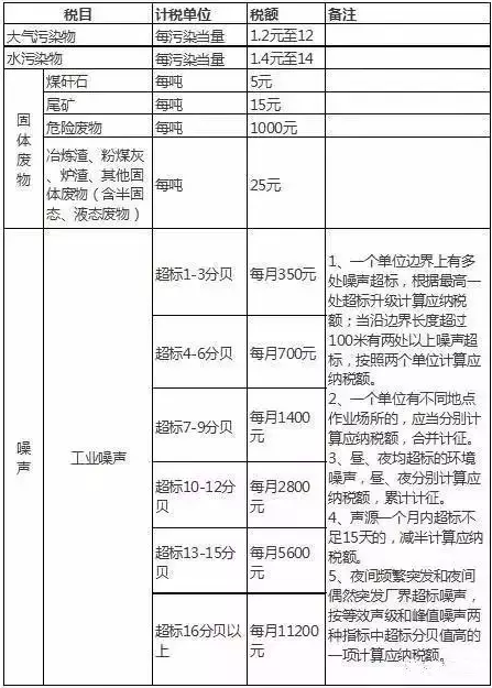 大气污染物税额幅度为每污染当量1.2元-12元;水污染物税额幅度为每污染当量1.4元-14元;固体废物按不同种类,税额为每吨5元-1000元;噪声按超标分贝数,税额为每月350元-11200元。