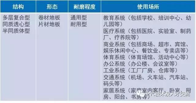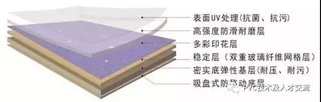 多层复合型PVC地板:有多层结构的地板,一般由4~5层结构叠压而成,一般有耐磨层(含UV处理)、印花膜层、玻璃纤维层、弹性发泡层、基层等。