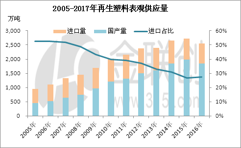 再生塑料进口基数较大,后期禁止进口后整体供应量损失严重。尽管在2013年海关绿篱行动后,进口政策收紧,后期进口量增速放缓,但在整体表观供应量中,进口料的占比仍高达30%左右。数据显示, 2016年再生塑料的表观供应量在2546.17万吨,进口量就高达696.17万吨,占比在27.34%。