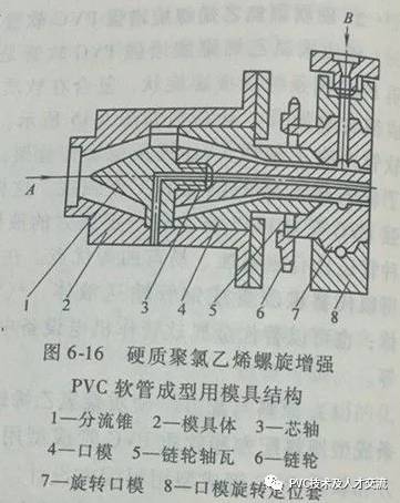 从增强软质PVC管的成型模具结构图中可以看出,这种复合模具结构和普通硬质PVC 管成型用模具结构基本相同,不同之处只是多了一段旋转的口模。挤出的软质PVC管用熔料,在复合模具中成型管坯时,由另一台成型硬质PVC螺旋条的挤出机挤出硬质PVC熔料条,从转动的口模侧进入软质PVC管坯内,由于口模的旋转,使硬质PVC条缠绕在软质PVC管坯圆周上,同时随向前移动的管坯移动,由于有较大流量的软质PVC熔料受成型模具内压力作用,则在向前移动时,没有出口模前软质PVC熔料把硬质PVC螺旋条完全包容,成型完整的硬质聚氯乙烯螺旋软质PVC管的管坯,被挤出口模,成型螺旋管