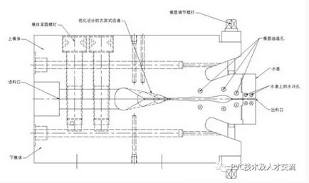 为了克服上述缺点,不少公司在模头流道优化设计的基础上,对模具结构进行了改进,设计了无阻流棒结构模具,并且模唇拼接式改进为模唇、模体一体式设计,甚至增设冷水模。如下图