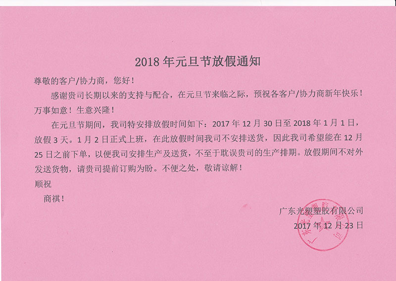 在元旦节期间,我司特安排放假时间如下:2017年12月30日至2018年1月1日,放假3天。1月2日正式上班,在此放假时间我司不安排送货,因此我司希望能在12月25日之前下单,以便我司安排生产及送货,不至于耽误贵司的生产排期。放假期间不对外发送货物,请贵司提前订购为盼。不便之处,敬请谅解!