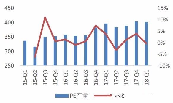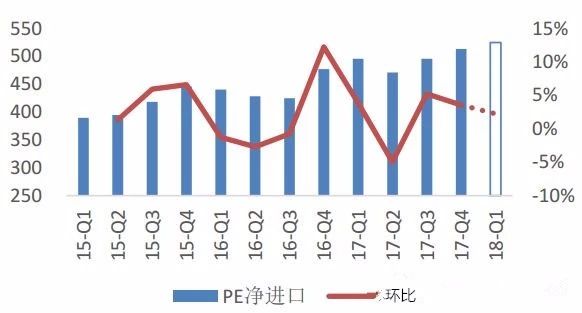 数据显示,中国聚乙烯进口依存度在40-45%左右,进口依赖度较高。2018年1月份聚乙烯进口128.9万吨,环比增加17%。2月份由于春节假期因素进口量下降明显,但3月份从远洋货物的到港情况来看,进口量仍存较高预期。