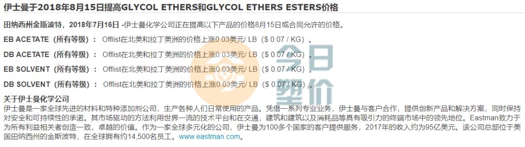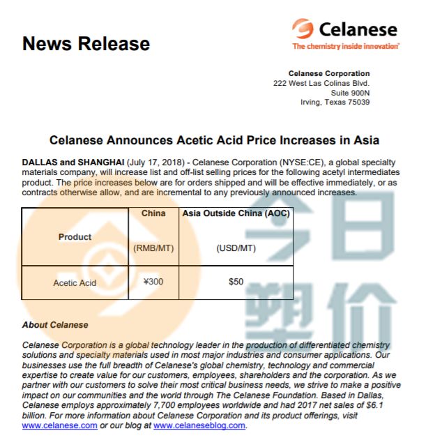 2018年7月17日,全球特种材料公司塞拉尼斯公司宣布将提高醋酸上市和售后价格。