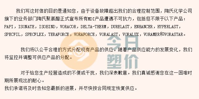 文章标题:涨势风波不断:科思创MDI装置停产、陶氏MDI不可抗力;塞拉尼斯醋酸上涨300元/吨;伊士曼、艾仕得涨价函再现!