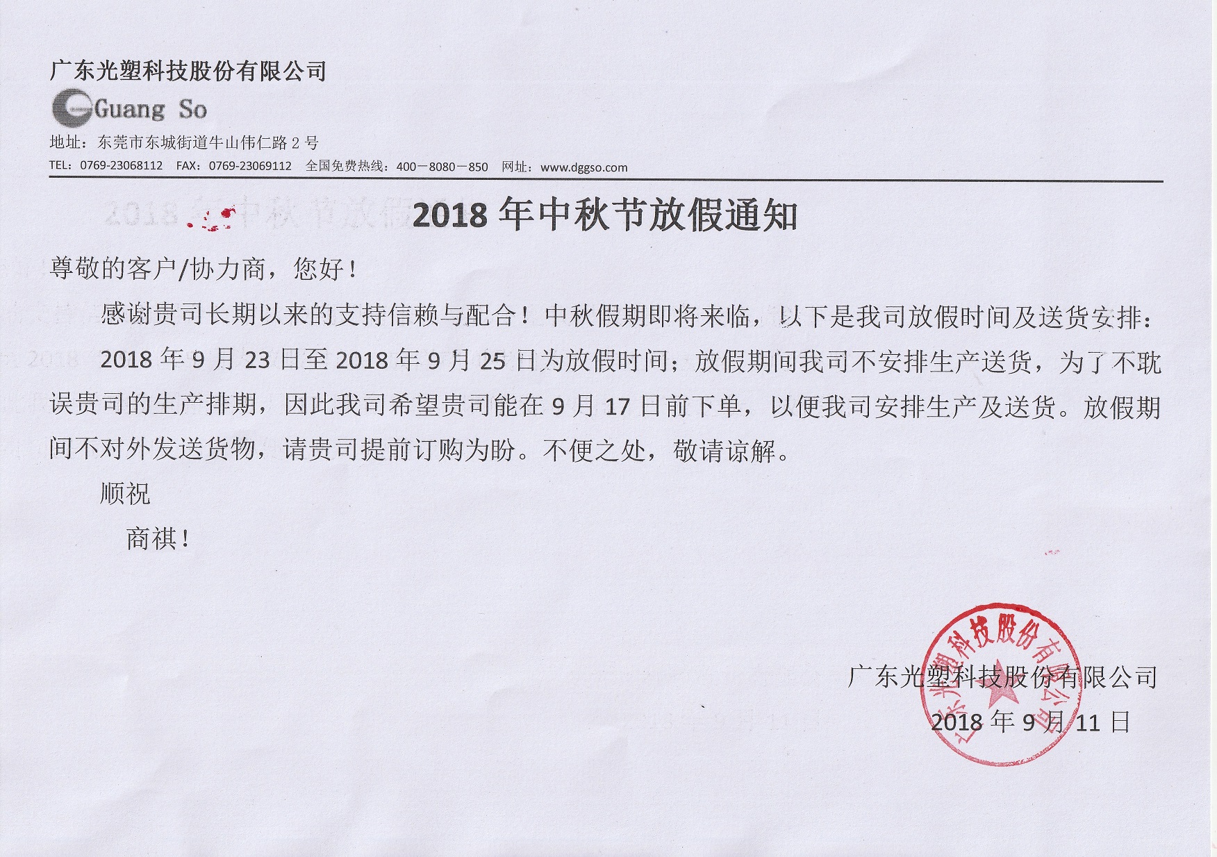 2018年9月23日至2018年9月25日为放假时间;放假期间我司不安排生产送货,为了不耽误贵司的生产排期,因此我司希望贵司能在9月17日前下单,以便我司安排生产及送货。放假期间不对外发送货物,请贵司提前订购为盼。不便之处,敬请谅解。