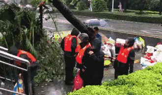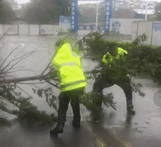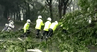 为了市民们的行车安全,交警蜀黍们正在努力清除被大风吹倒的树