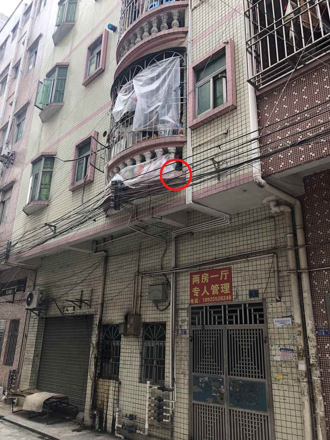 赶到现场之后,他们发现男婴卡在二楼电线上,双脚乱蹬,一直在哭,随时都有掉落的危险!