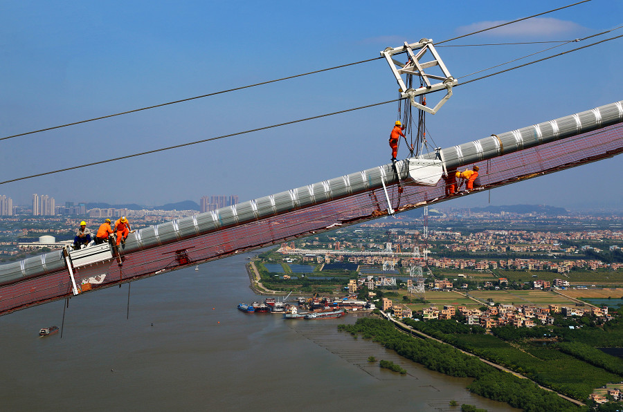 在大沙水道,193米高的东塔从江面直冲云霄。项目施工方相关负责人介绍:“主塔共分41节,每节精度误差不超过10毫米。受广东炎热天气的影响,测量监控和混凝土浇筑一般都在晚上进行。”如果把桥梁比作一杆秤,锚碇就相当于秤砣,桥梁的荷载主要由桥两端的秤砣来承受。在东锚碇施工中,施工方用了5900吨钢筋,混凝土浇筑方量18.6万方,相当于62个标准游泳池,重量达到46.5万吨,经过无数次的模板搭建和浇筑才完成。
