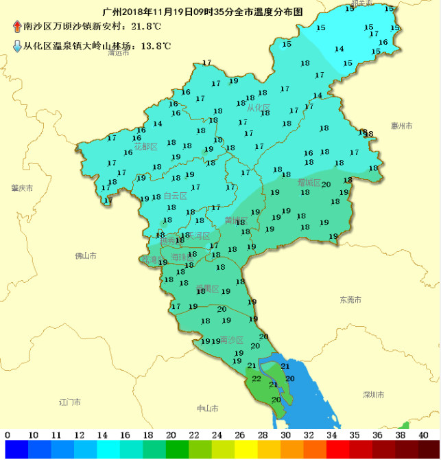 据广州市气象台预测,今日白天:小雨转阴天;夜间:阴天到多云,局部有小雨;气温介于17到22℃之间;冷空气来得很慢,各位一定要耐心等候。