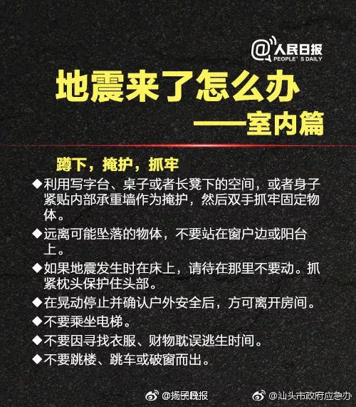 今晨发生地震时,很多人还在家里,有些惊慌失措。遇到地震了怎么办?不少网友发出疑问“震感强烈,我应该跑到楼下吗”?那么,当地震发生时,我们应该冲出到户外,还是待在原地呢?灾难一旦发生,生死存亡就在瞬息之间。地震来时如何躲避?如何自救?