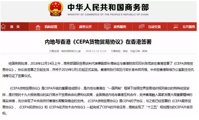 经国务院批准,2018年12月14日上午,商务部国际贸易谈判代表兼副部长傅自应与香港财政司司长陈茂波在香港签署了《CEPA货物贸易协议》。