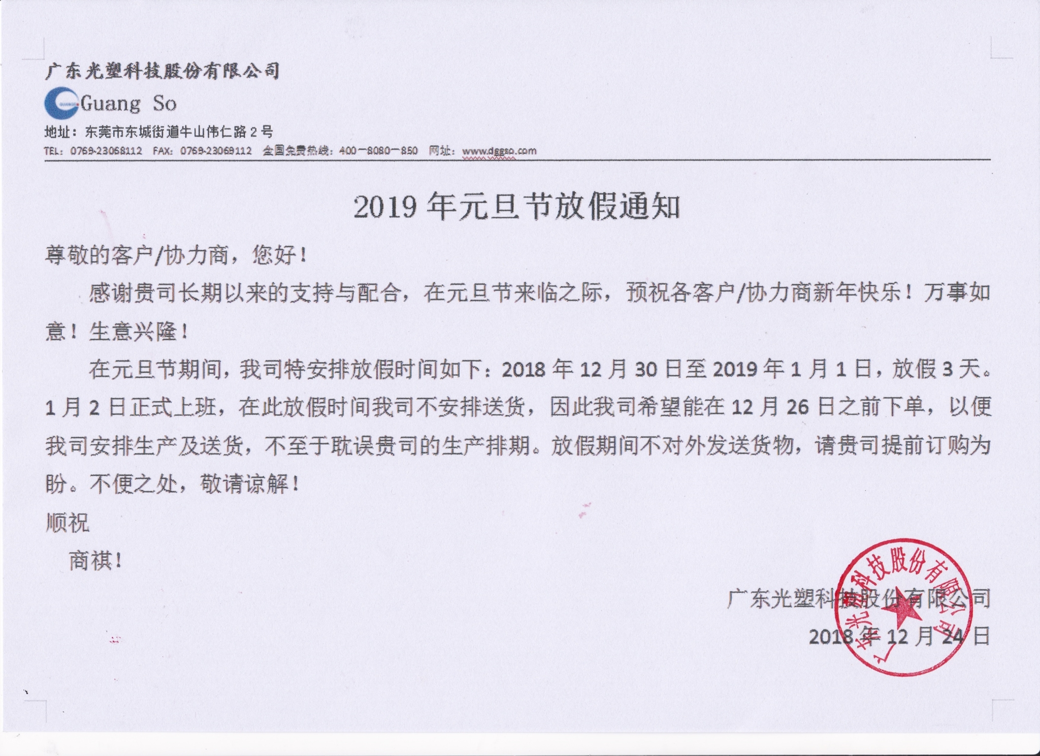 感谢贵司长期以来的支持与配合,在元旦节来临之际,预祝各客户/协力商新年快乐!万事如意!生意兴隆!在元旦节期间,我司特安排放假时间如下:2018年12月30日至2019年1月1日,放假3天。1月2日正式上班,在此放假时间我司不安排送货,因此我司希望能在12月26日之前下单,以便我司安排生产及送货,不至于耽误贵司的生产排期。放假期间不对外发送货物,请贵司提前订购为盼。不便之处,敬请谅解!