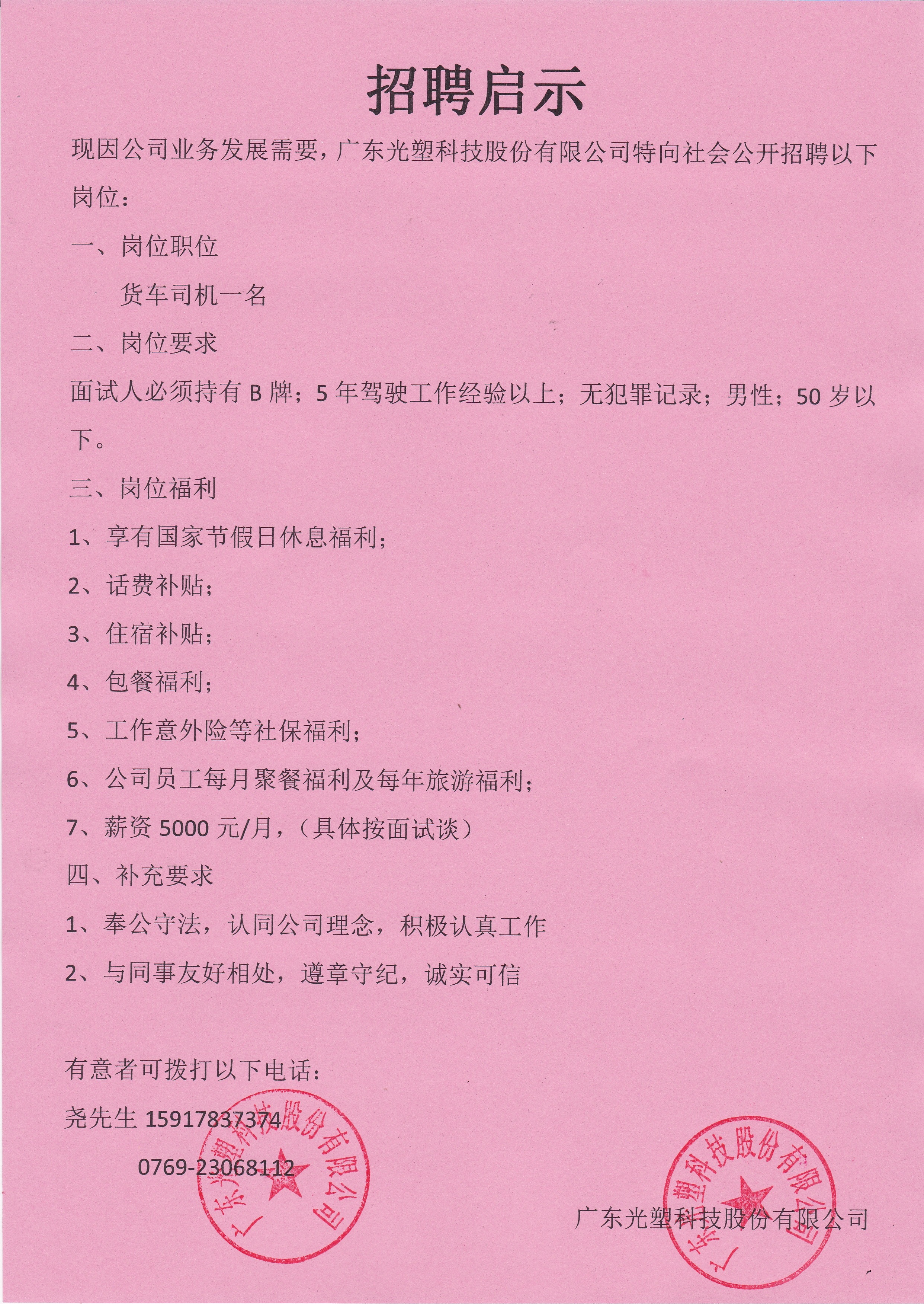 因公司需要,现面向社会公开招聘货车司机一名;要求:男性,50岁以下,5年以上驾驶工作经验,持有B牌,无犯罪记录。一经录取享有公司各种福利待遇。
