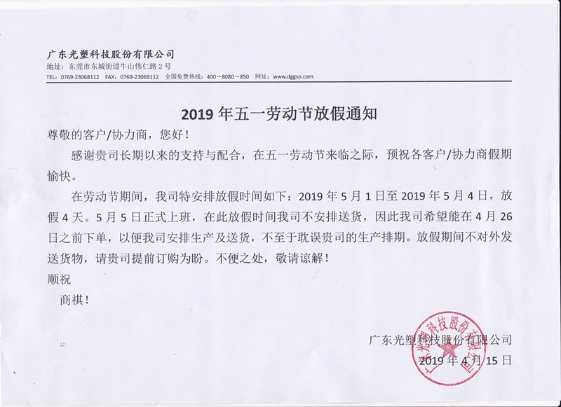 感谢贵司长期以来的支持与配合,在五一劳动节来临之际,预祝各客户/协力商假期愉快。在劳动节期间,我司特安排放假时间如下:2019年5月1日至2019年5月4日,放假4天。5月5日正式上班,在此放假时间我司不安排送货,因此我司希望能在4月26日之前下单,以便我司安排生产及送货,不至于耽误贵司的生产排期。放假期间不对外发送货物,请贵司提前订购为盼。不便之处,敬请谅解!