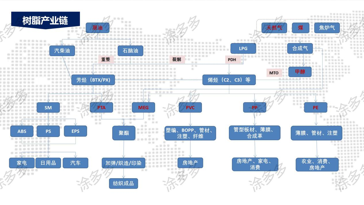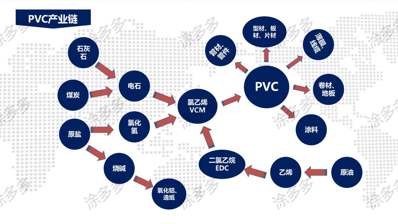 PVC产业链,氯碱企业的原料是电石和原盐,石灰石+煤炭到电石,原盐电解到氯化氢和烧碱,电石和液氯到单体VCM。VCM聚合在到PVC,另一条路线是原油裂解到乙烯,乙烯到EDC在到VCM。在到PVC,进而到PVC下游各个制品行业。